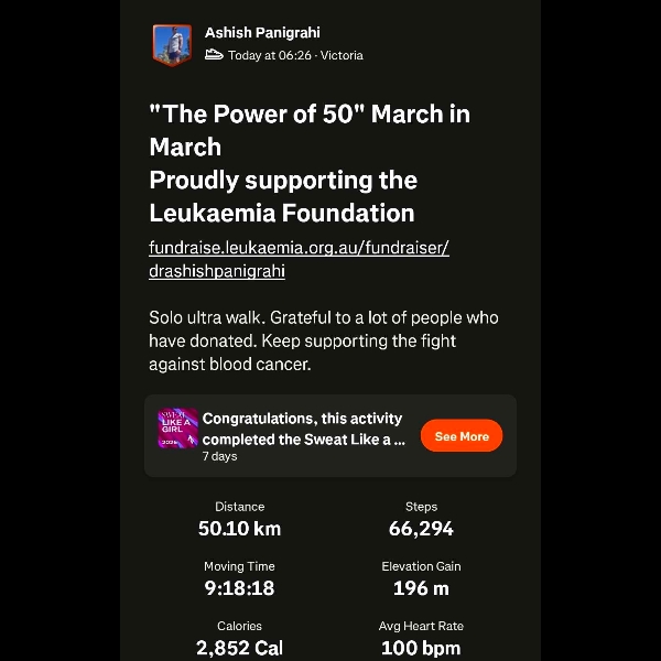 Every year the 1st Sat of March I will walk 50 kms solo to complete the walk on the same day. In 2026, I intend to start the walk from Point Gellibrand Lookout Williamstown at 6am.